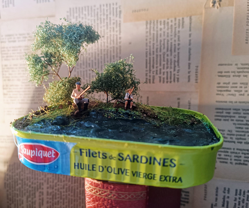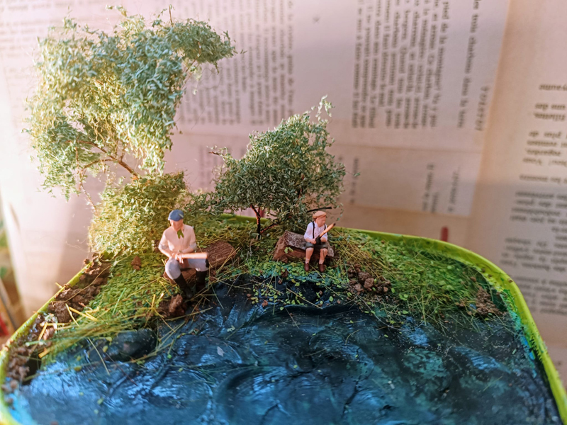 La charrette ciel est réalisée par Monique, la brune par Maya et la verte par Dominique et celle avec des jouets par Michelle.